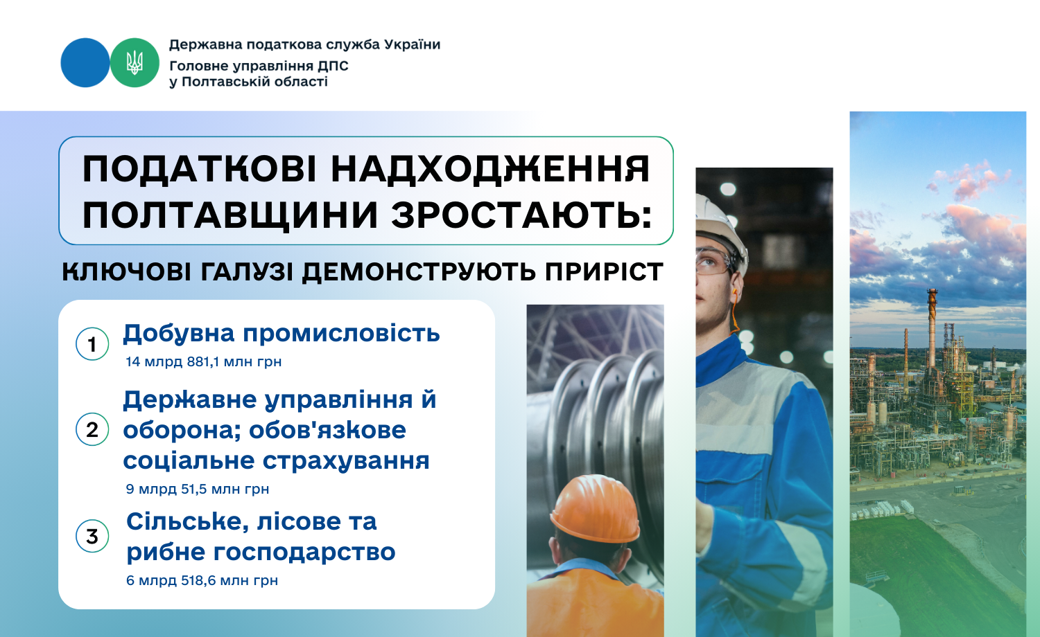 У січні – листопаді 2025 року платики Полтавщини сплатили до Зведеного бюджету України значні суми податкових платежів. Основними бюджетоформуючими галузями залишаються добувна промисловість – 14 млрд 881,1 млн грн (25,9 відс.), державного управління й оборони; обов'язкового соціального страхування – 9 млрд 51,5 млн грн (15,8 відс.), а також сільського, лісового та рибного господарства – 6 млрд 518,6 млн грн (11,3 відсотка).