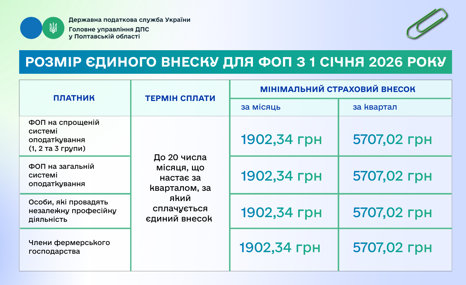 Розмір єдиного внеску ФОП з 1 січня 2026 року