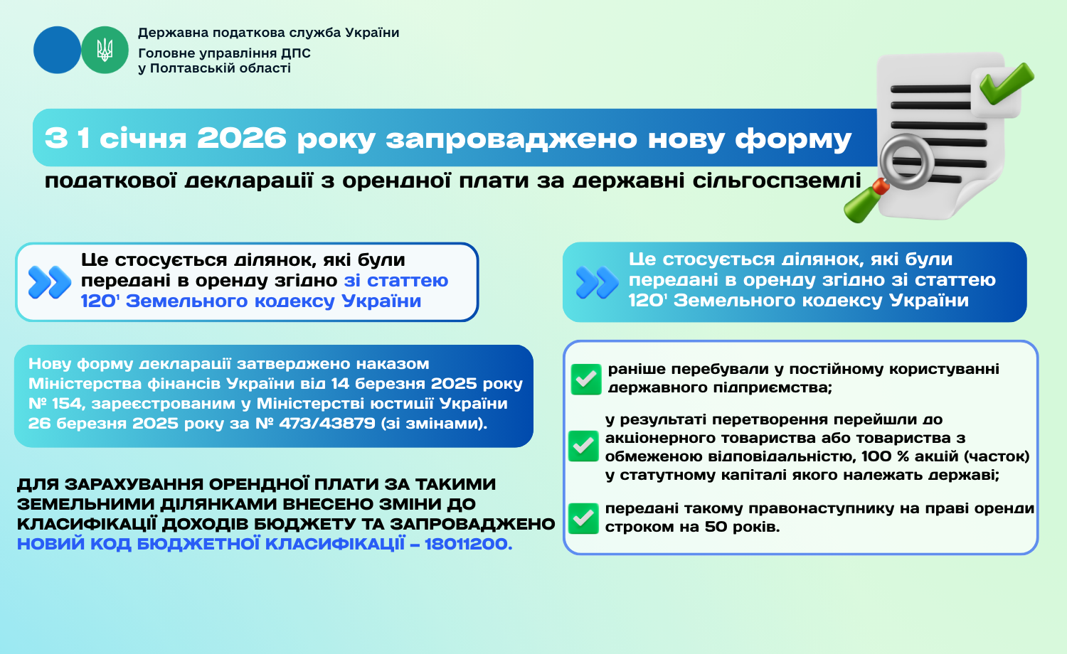 З 1 січня 2026 року запроваджено нову форму податкової декларації з орендної плати за державні сільгоспземлі