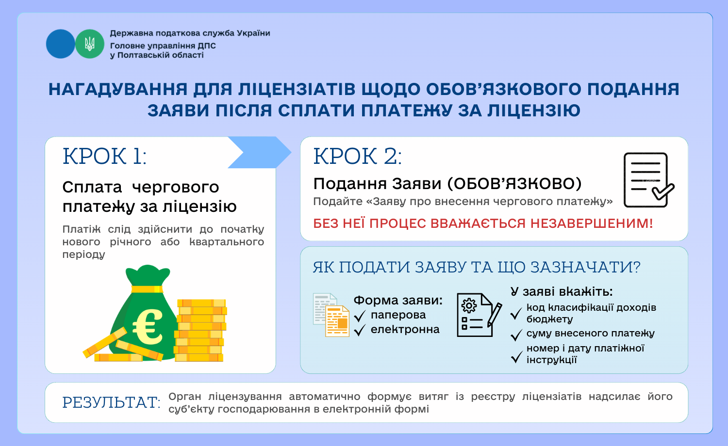 Нагадування для ліцензіатів щодо обов’язкового подання заяви після сплати платежу за ліцензію