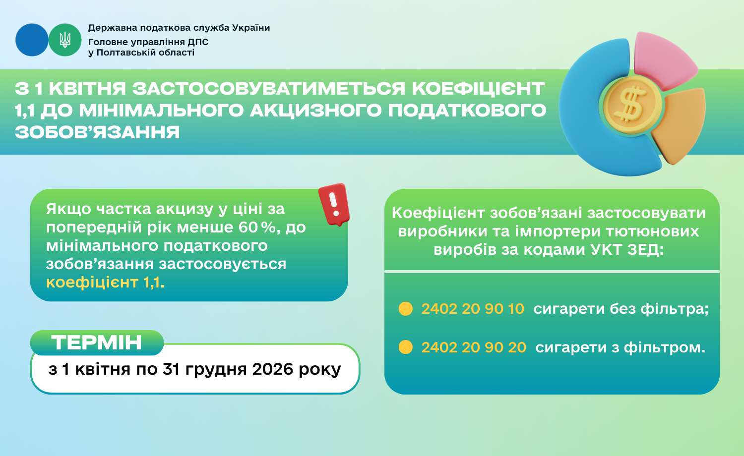 Акциз на сигарети у 2026 році: з 1 квітня застосовуватиметься коефіцієнт 1,1 до мінімального акцизного податкового зобов’язання