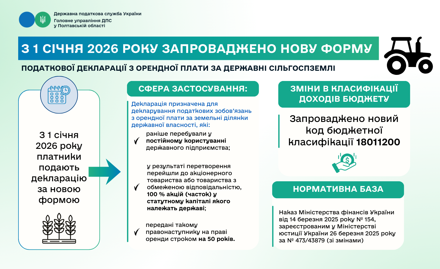 З 1 січня 2026 року запроваджено нову форму податкової декларації з орендної плати за державні сільгоспземлі