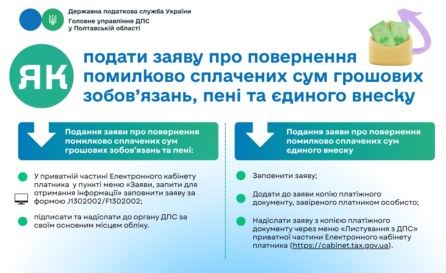 Як подати заяву про повернення помилково сплачених сум грошових зобов’язань, пені та єдиного внеску