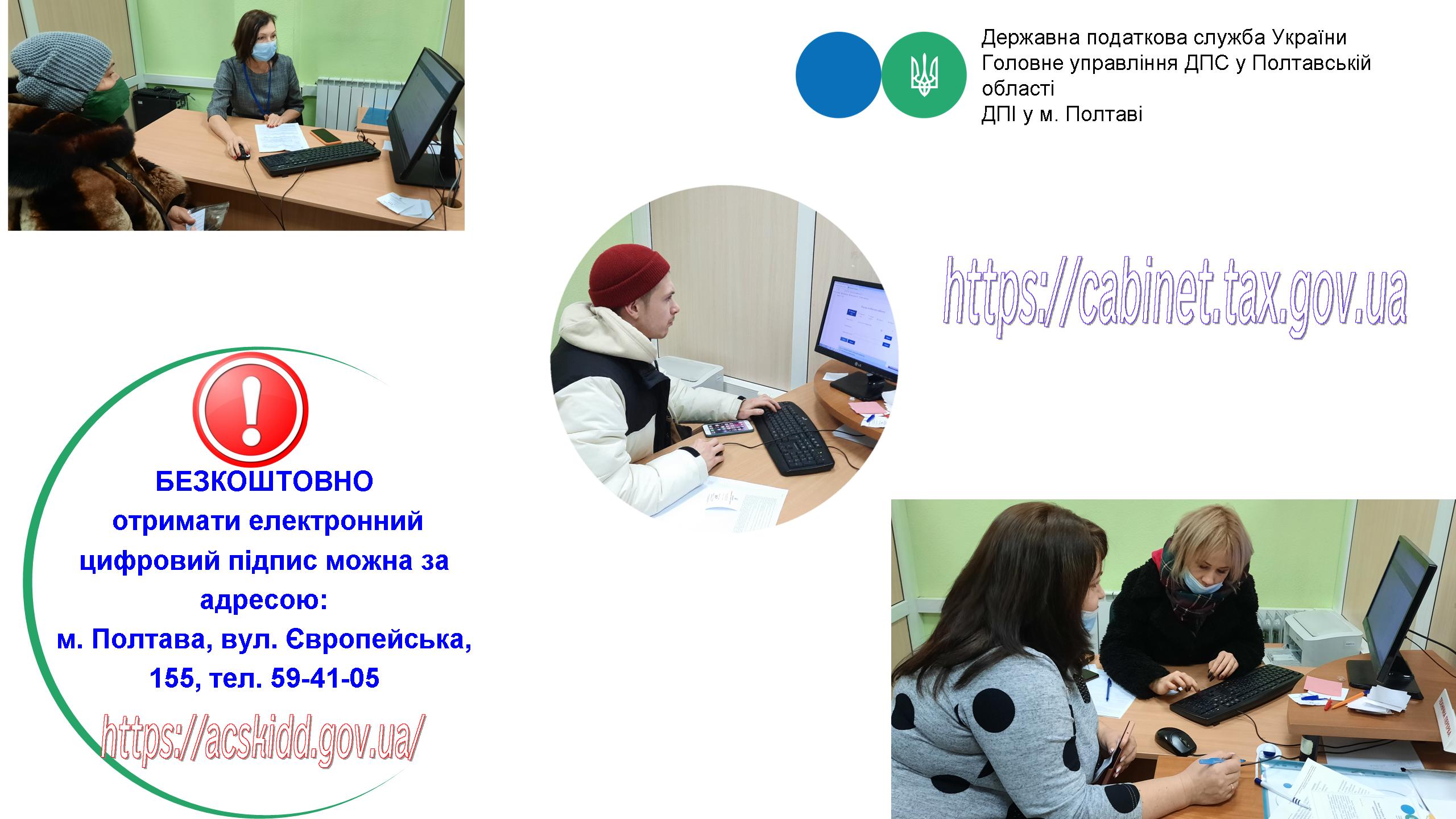 З питань отримання ключа електронного цифрового підпису в                 м. Полтаві платники мають можливість звернутися до Кваліфікованого надавача електронних довірчих послуг Інформаційно-довідкового департаменту ДПС (https://acskidd.gov.ua/), що знаходиться в приміщенні ЦОП ДПІ у м. Полтаві за адресою: м. Полтава, вул. Європейська, 155.