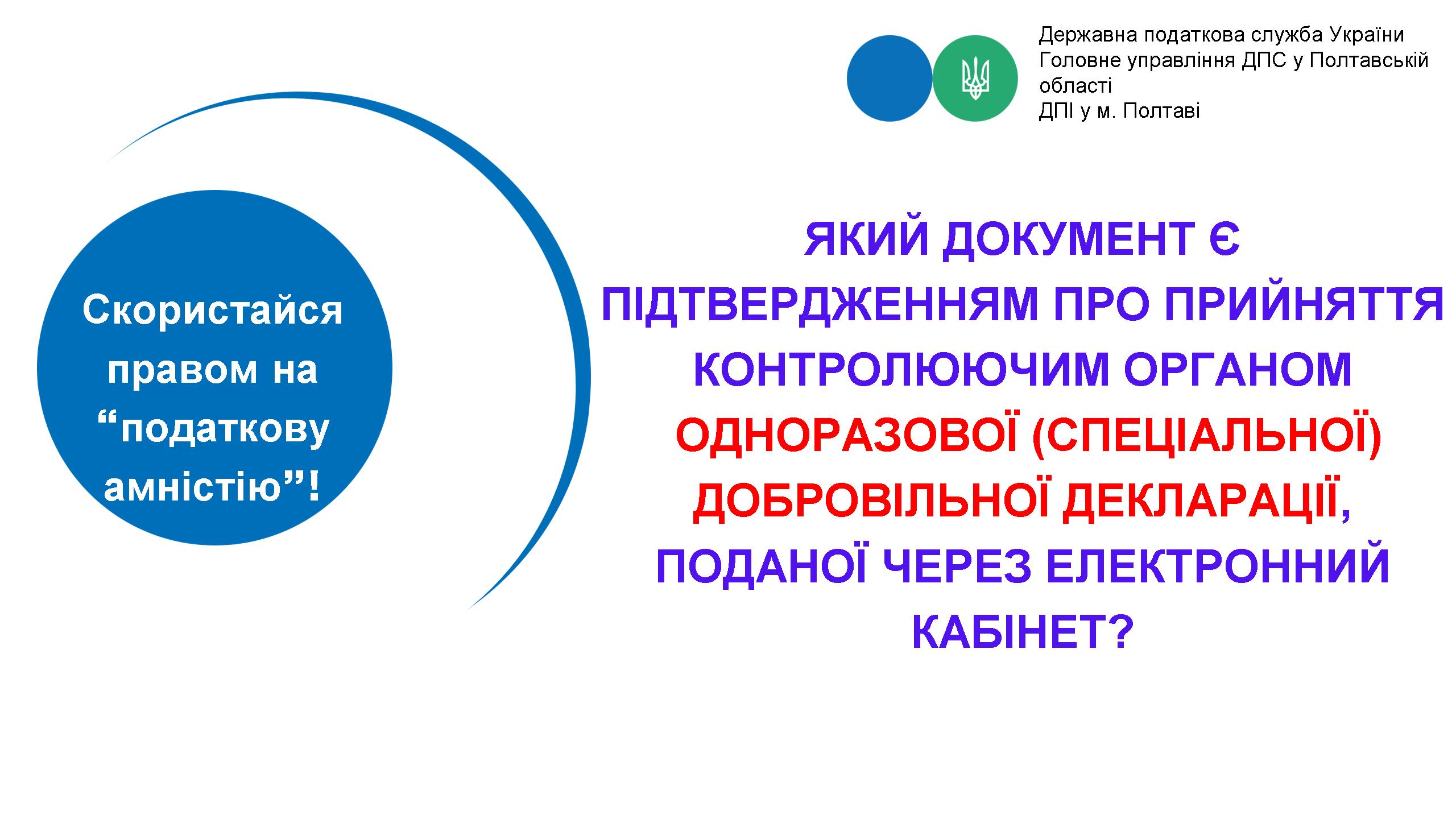 Який документ є підтвердженням про прийняття контролюючим органом одноразової (спеціальної) добровільної декларації, поданої через Електронний кабінет? (ДПІ у м. Полтаві ГУ ДПС у Полтавській області )