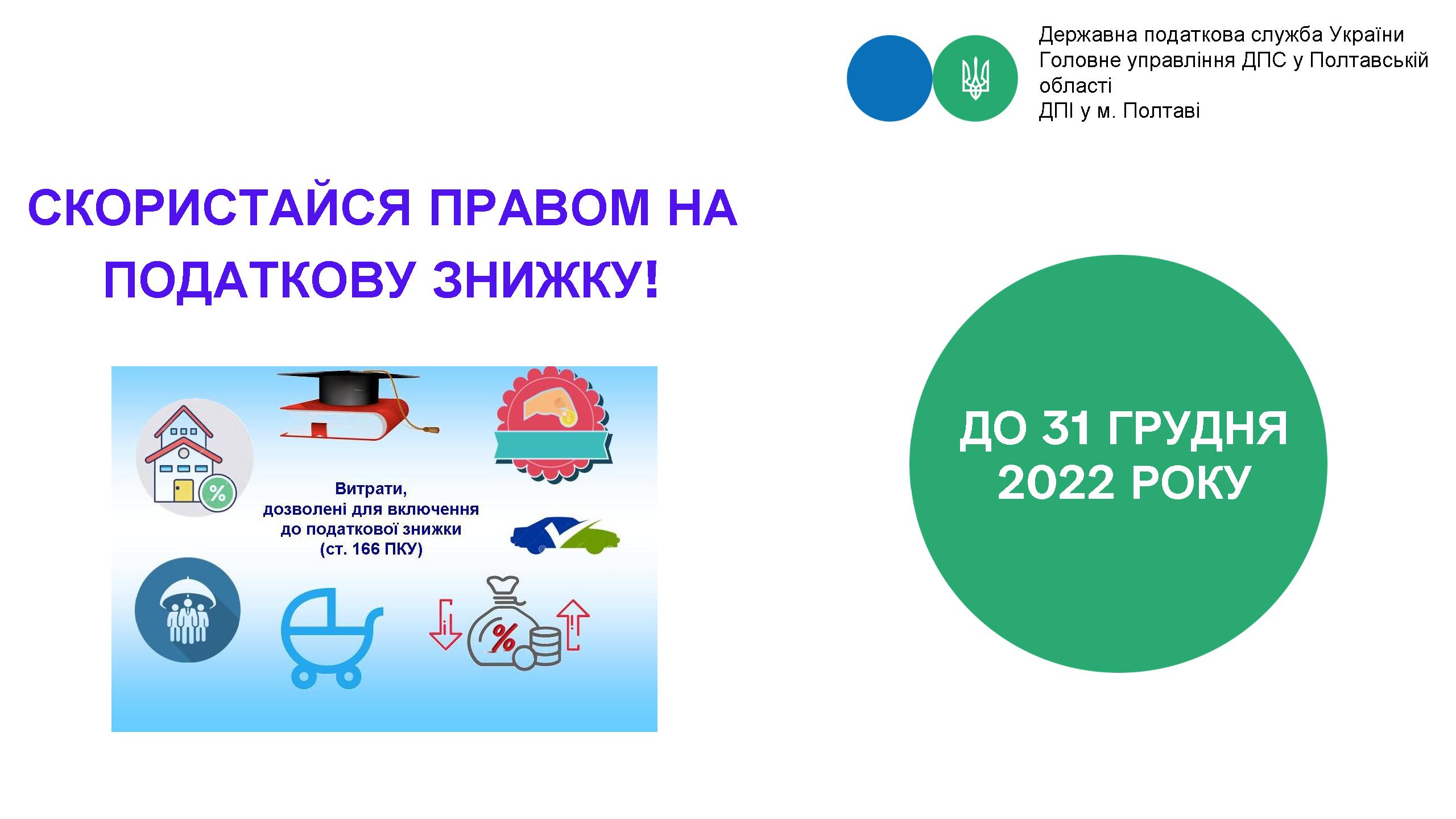 ДПІ у м. Полтаві нагадує, що податкова знижка отримується в поточному році за минулий. Треба пам’ятати, що право на податкову знижку не накопичується та не переноситься на наступний рік. Тобто, граничний термін подання податкової декларації для реалізації права на податкову знижку за   2021 рік – 31 грудня 2022 року.