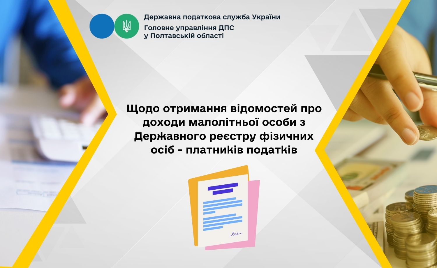 Гребінківська ДПІ Головного управління ДПС у Полтавській області інформує, що для отримання відомостей про доходи малолітньої особи з Державного реєстру фізичних осіб – платників податків необхідно, щоб така малолітня особа була зареєстрована у Державному реєстрі.