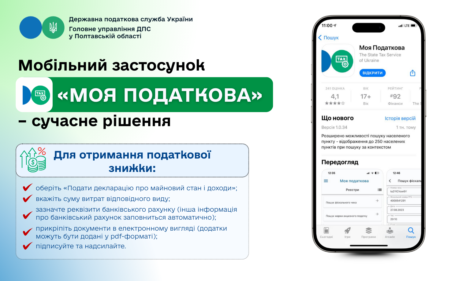Новосанжарський сектор обслуговуваня платників Полтавської ДПІ повідомляє, що мобільний застосунок «Моя податкова» у розділі «Послуги» надає можливість подати податкову декларацію про майновий стан і доходи для отримання податкової знижки: