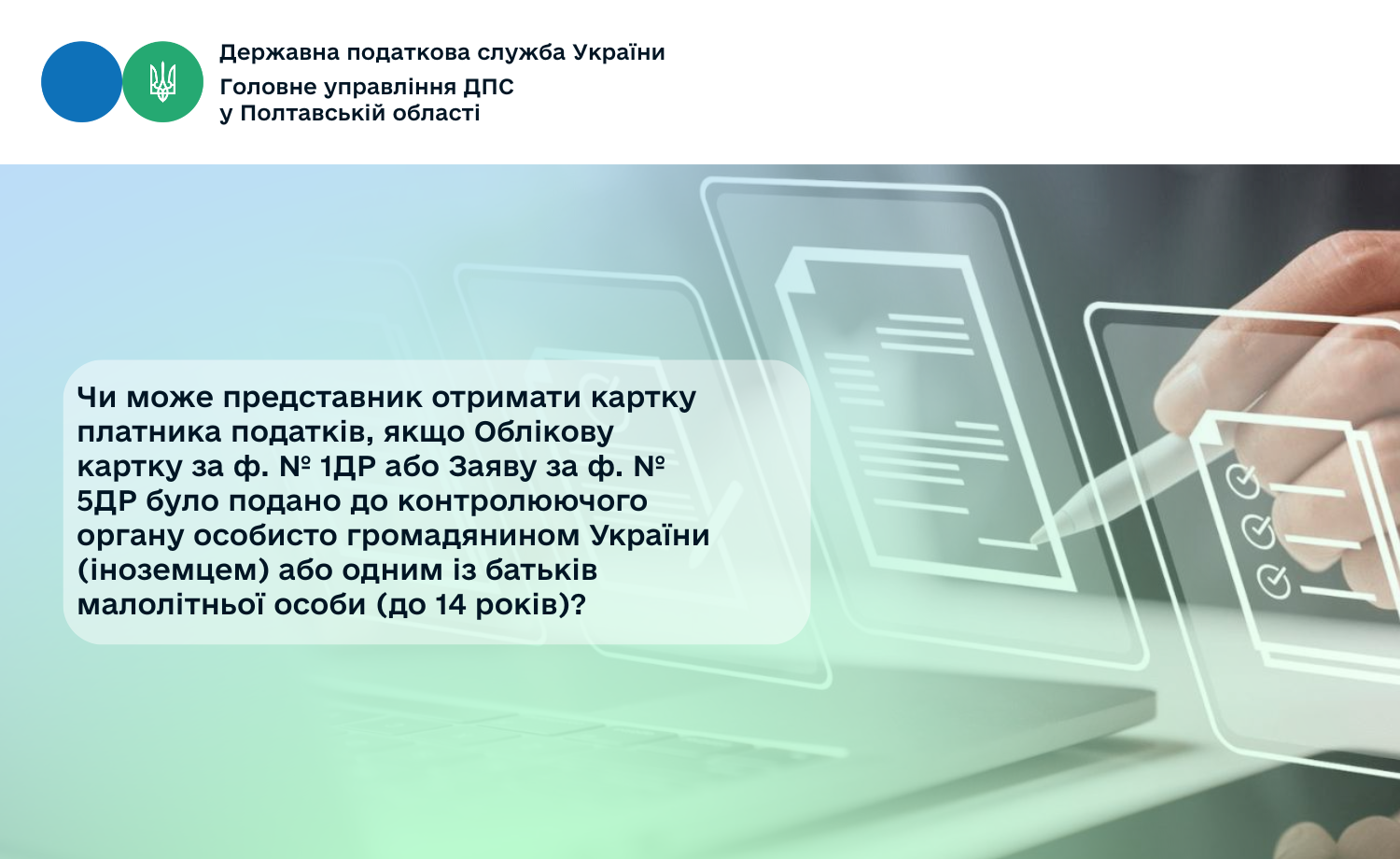 Миргородська ДПІ Головного управління ДПС у Полтавській області інформує, що відповідно до п. 70.5 ст. 70 Податкового кодексу України від 02 грудня 2010 року № 2755-VI (далі – ПКУ) та п. 1 розд. VII Положення про реєстрацію фізичних осіб у Державному реєстрі фізичних осіб – платників податків, затвердженого наказом Міністерства фінансів України від 29.09.2017 № 822 (далі – Положення № 822), фізична особа незалежно від віку (як резидент, так і нерезидент), яка не включена до Державного реєстру фізичних осіб – платників податків (далі – ДРФО), зобов’язана особисто або через представника подати до контролюючого органу за своєю податковою адресою (місцем проживання) або до будь-якого контролюючого органу облікову картку фізичної особи – платника податків за формою № 1ДР (далі – Облікова картка за ф. № 1ДР), що є водночас заявою для реєстрації у ДРФО, та пред’явити документ, що посвідчує особу, який містить необхідні для реєстрації реквізити (прізвище, ім’я, по батькові (за наявності), дату народження, місце народження, місце проживання (за наявності), громадянство).