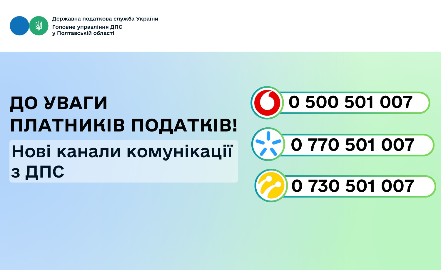 Кременчуцька ДПІ Головного управління ДПС у Полтавській області інформує, що для зручності громадян та бізнесу Контакт-центр Державної податкової служби України працює з номерами мобільних операторів: