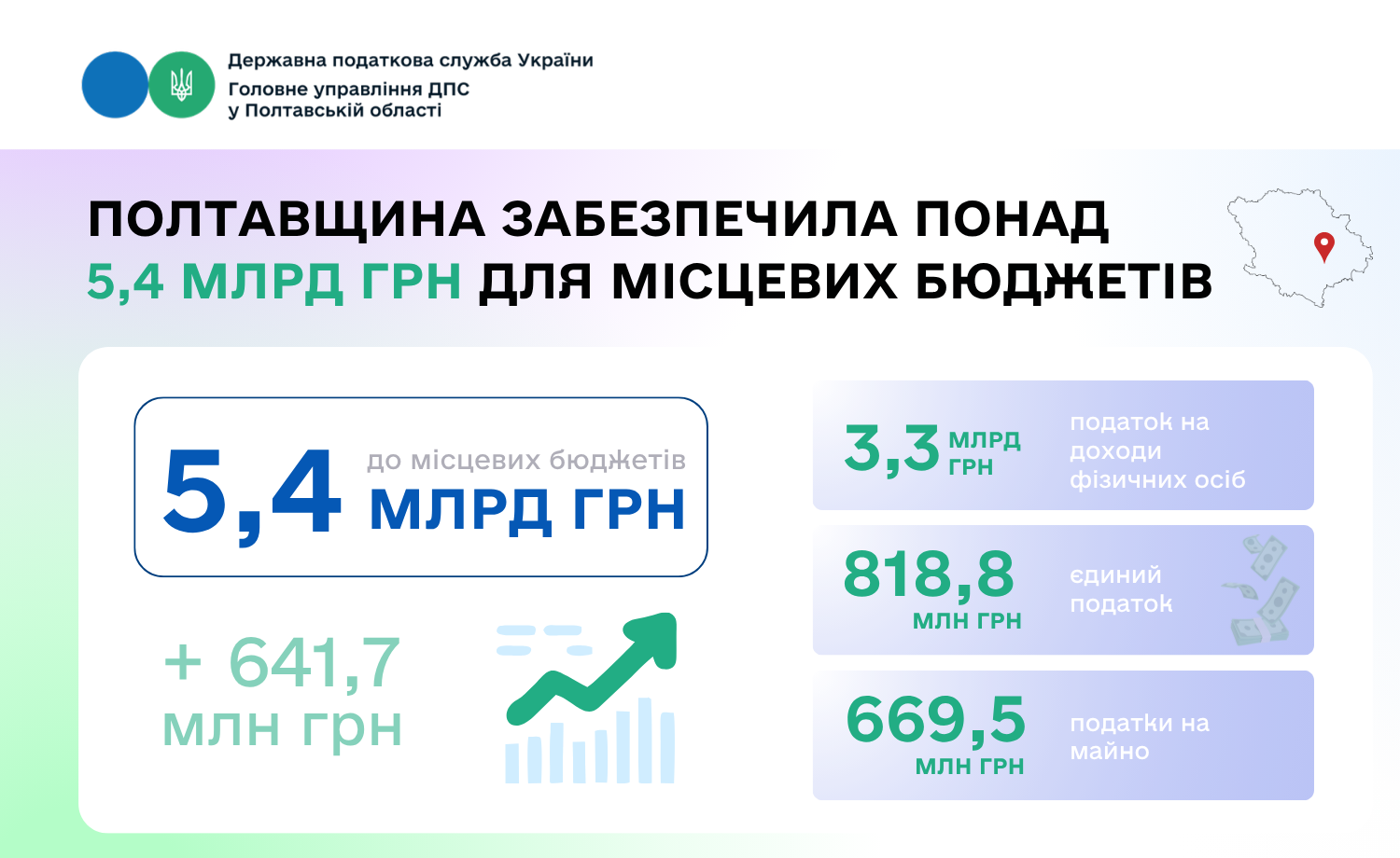 «Порівняно з аналогічним періодом минулого року, доходи громад зросли на 13,4 відсотка. Це означає, що органи місцевого самоврядування отримали додаткові 641,7 млн гривень для реалізації соціальних та інфраструктурних проєктів», - підкреслив начальник податкової служби Полтавщини Сергій Левченко.