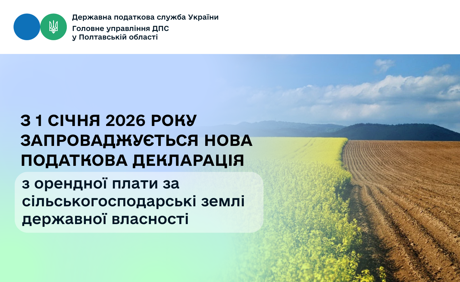 Головне управління ДПС у Полтавській області інформує, що з 1 січня 2026 року запроваджується нова форма податкової декларації з орендної плати для земельних ділянок сільськогосподарського призначення державної власності.