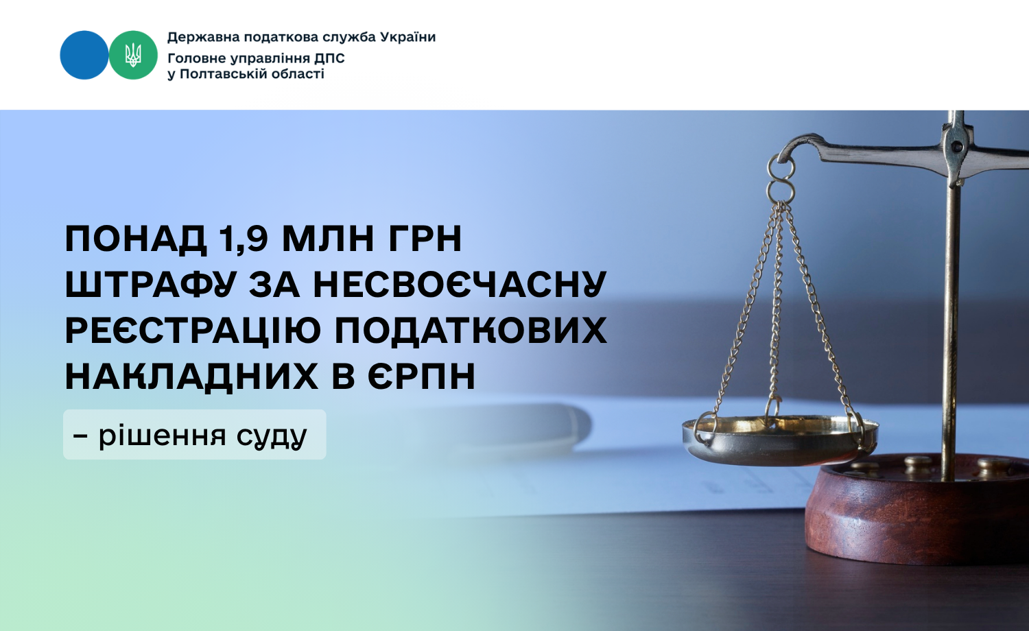 Головне управління ДПС у Полтавській області повідомляє, що контролюючим органом проведено камеральну перевірку платника. За результатами перевірки складено акт, яким встановлено порушення платником граничних термінів реєстрації податкових накладних в Єдиному реєстрі податкових накладних. На підставі акта перевірки контролюючим органом прийнято податкове повідомлення-рішення, яким до платника застосовано штрафні (фінансові) санкції у сумі 1 903,6 тис. гривень.
