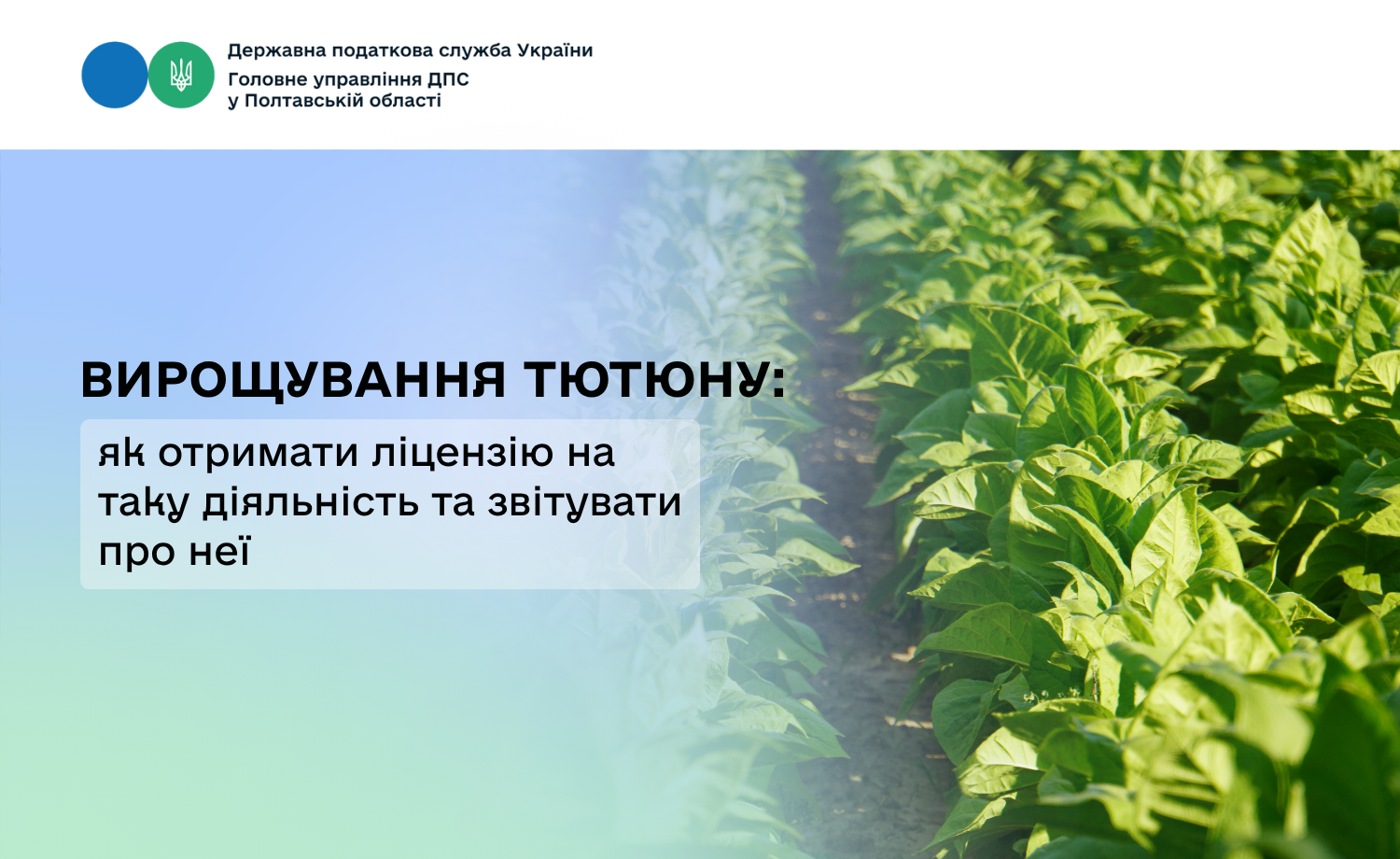 Головне управління ДПС у Полтавській області інформує, що діяльність з вирощування тютюну суб’єкти господарювання можуть здійснювати на підставі ліцензії на право вирощування тютюну. Таке ліцензування було запроваджено з 1 січня 2025 року.