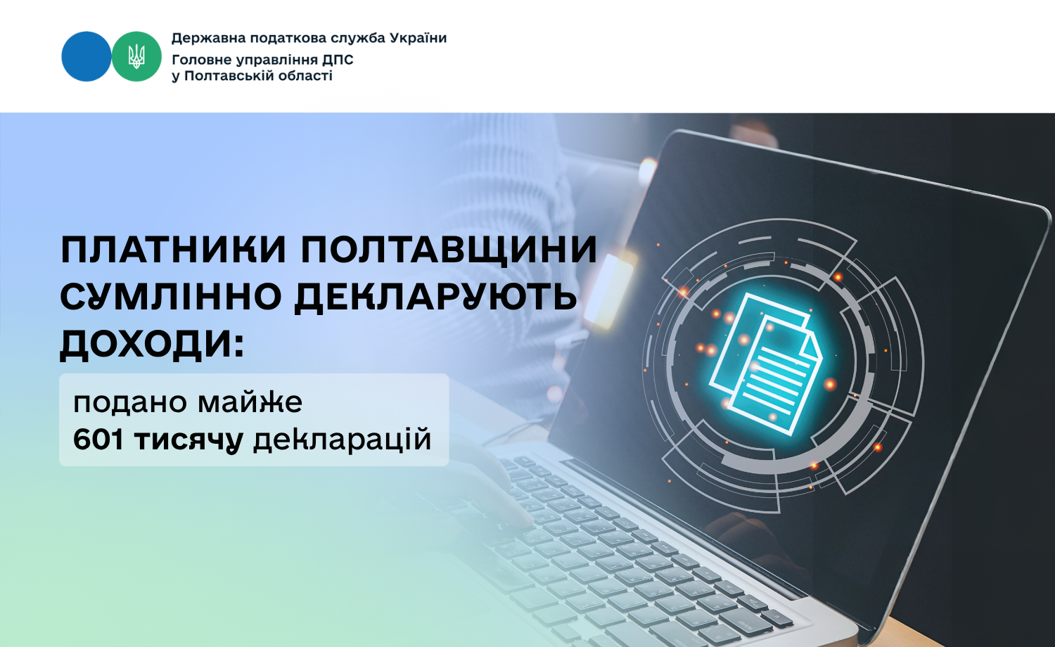 У Головному управлінні ДПС у Полтавській області повідомляють, що протягом січня – жовтня 2025 року платники податків Полтавщини подали до контролюючих органів 600 801 податкових декларацій, при цьому 598 952 (99,68 %) із них направлені засобами телекомунікаційного зв’язку. Зокрема, юридичними особами подано 288 151 електронну декларацію, а фізичними особами – 310 151.