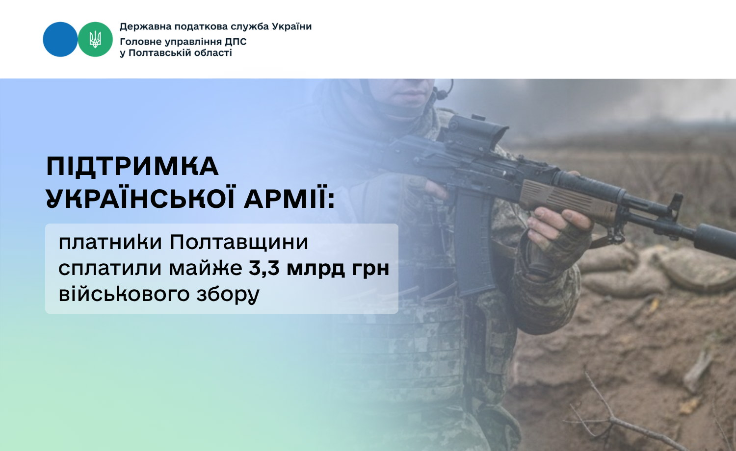 У Головному управлінні ДПС у Полтавській області повідомляють, що за січень – вересень 2025 року платники податків Полтавщини спрямували до державного бюджету 3 млрд 289,7 млн грн військового збору.