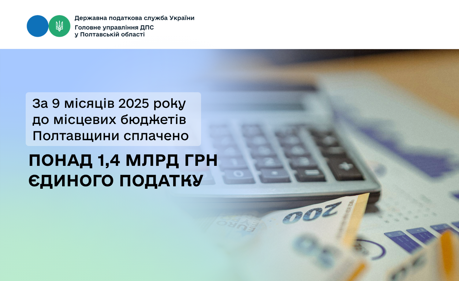 За 9 місяців 2025 року до місцевих бюджетів Полтавщини сплачено понад 1,4 млрд грн єдиного податку