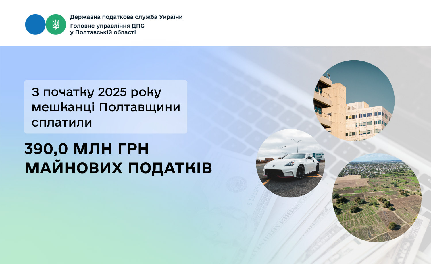 З початку 2025 року мешканці Полтавщини сплатили 390,0 млн грн майнових податків