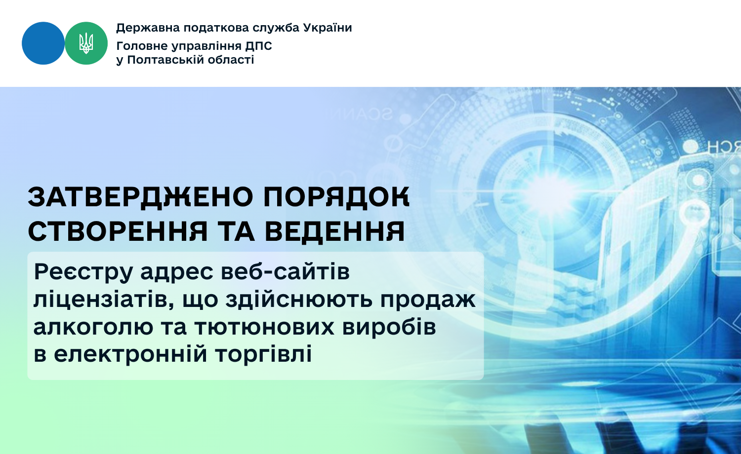 Головне управління ДПС у Полтавській області повідомляє, що 24 жовтня 2025 року набрала чинності постанова Кабінету Міністрів України від 22.10.2025 № 1320, якою затверджено Порядок створення та ведення Реєстру адрес веб-сайтів ліцензіатів, що здійснюють продаж пива (крім безалкогольного), алкогольних, слабоалкогольних напоїв, тютюнових виробів, електронних сигарет, рідин, що використовуються в електронних сигаретах, пристроїв для споживання тютюнових виробів без їх згоряння шляхом електронної торгівлі (з використанням засобів дистанційного зв’язку або через інтернет-магазини) (далі – Реєстр).
