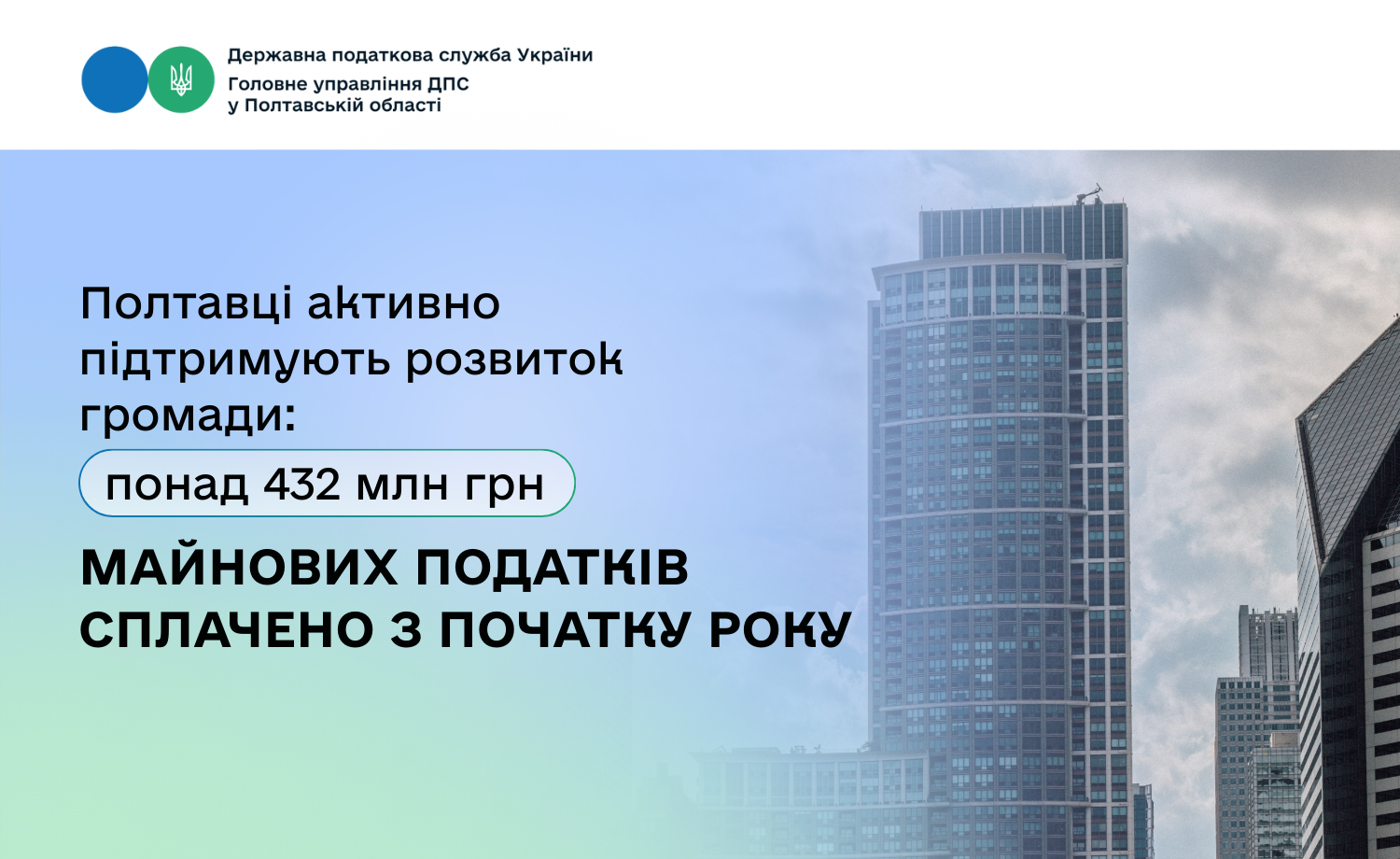 У Головному управлінні ДПС у Полтавській області повідомляють, що протягом десяти місяців 2025 року фізичні особи регіону спрямували до місцевих бюджетів  432,6 млн грн податку на нерухоме майно, відмінне від земельної ділянки, плати за землю та транспортного податку. Це на 79,8 млн грн більше, ніж за аналогічний період минулого року.