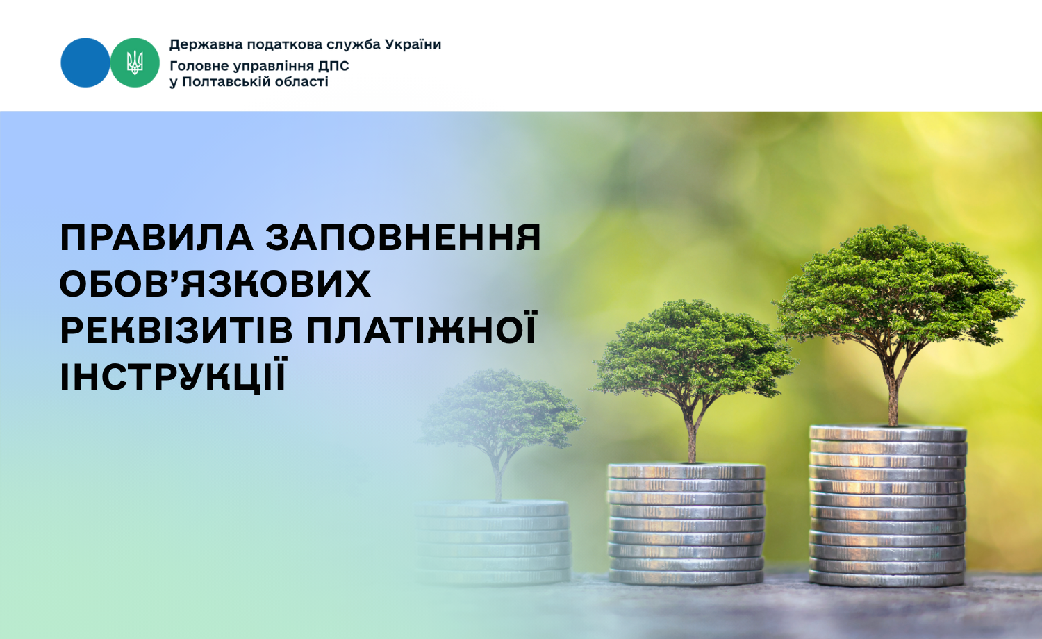 Головне управлінні ДПС у Полтавській області нагадує про правила заповнення обов’язкових реквізитів платіжної інструкції відповідно до Постанови Національного банку України  від 22.07.2022 № 163 «Про затвердження Інструкції про безготівкові розрахунки в національній валюті користувачів платіжних послуг» та наказу Міністерства фінансів України від 22.03.2023 № 148 «Про затвердження Порядку заповнення реквізиту «Призначення платежу» платіжної інструкції під час сплати (стягнення) податків, зборів, митних, інших платежів, єдиного внеску на загальнообов’язкове державне соціальне страхування, внесення авансових платежів (передоплати), грошової застави, а також у разі їх повернення».