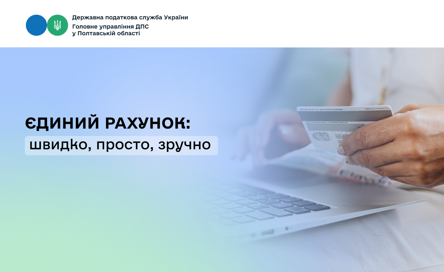 Головне управління ДПС у Полтавській області інформує, що єдиний рахунок – це рахунок, відкритий у Державній казначейській службі України на ім’я ДПС. Він використовується для сплати податків і зборів. Це зручний спосіб, адже він дозволяє економити час та спрощує формування розрахункових документів.