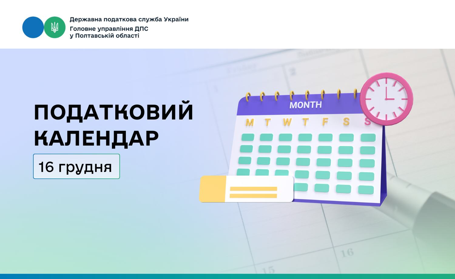 У Головному управлінні ДПС у Полтавській області нагадують платникам податків, що 16 грудня: