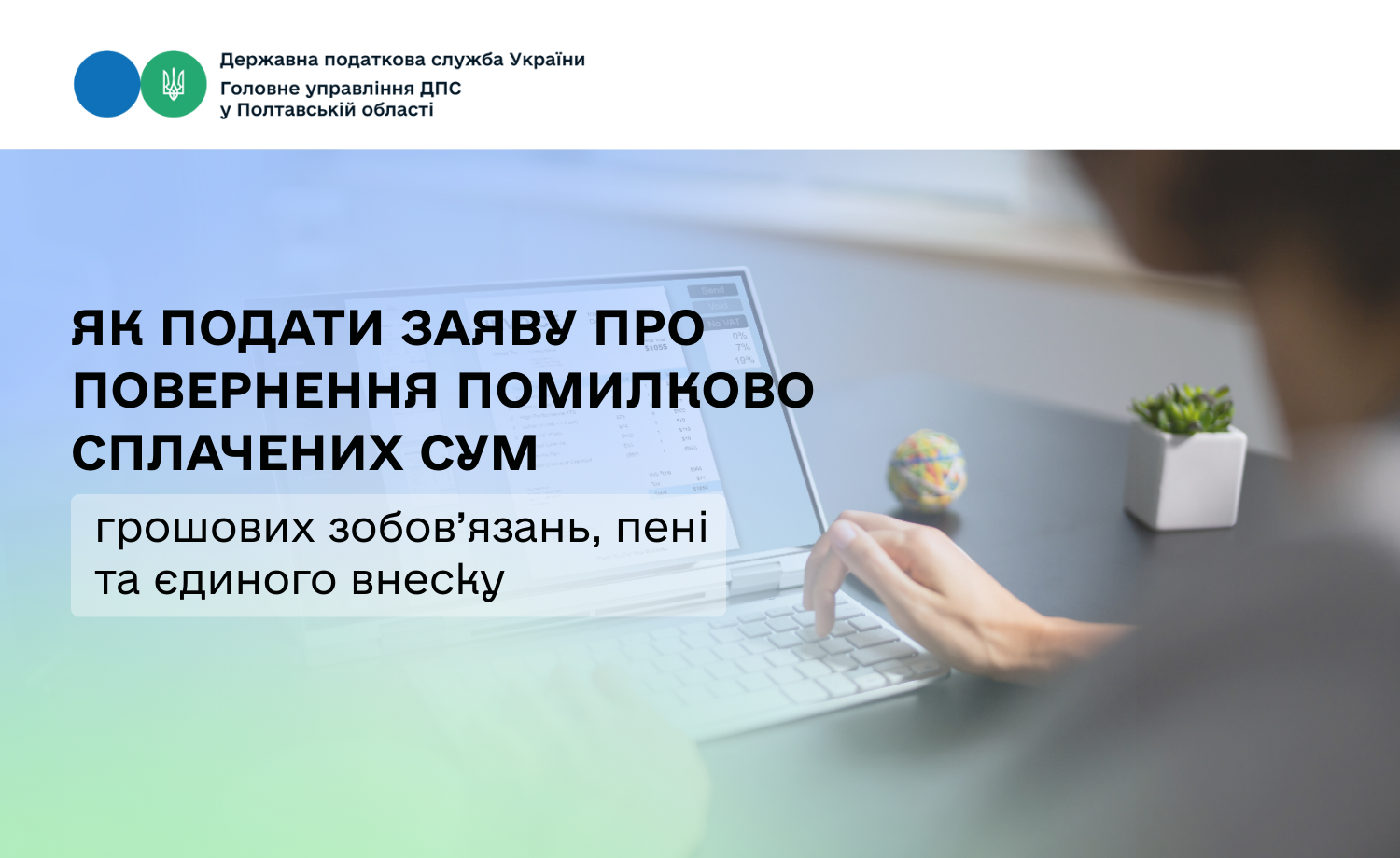 У Головному управлінні ДПС у Полтавській області повідомляють, що для подання заяви про повернення помилково сплачених сум грошових зобов’язань та пені необхідно:
