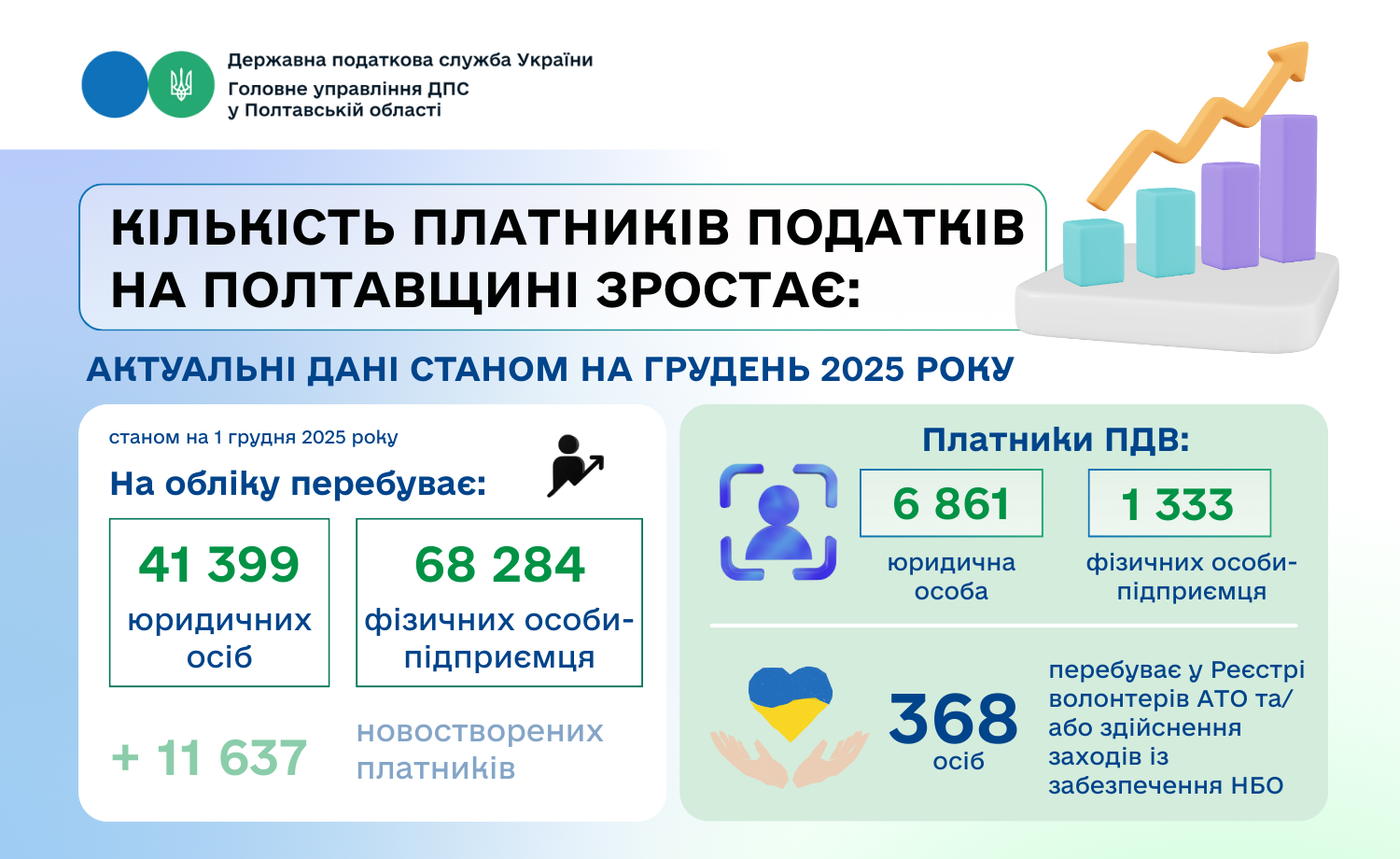 У Головному управлінні ДПС у Полтавській області повідомляють, що станом на 1 грудня 2025 року в органах податкової служби Полтавщини на обліку перебуває 109 683 платника податків, серед них: