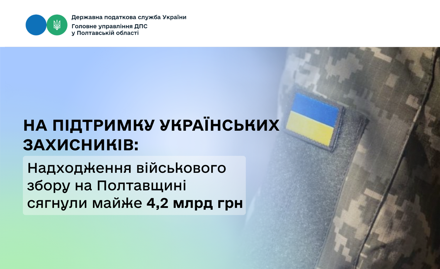 У Головному управлінні ДПС у Полтавській області повідомляють, що протягом січня – листопада 2025 року платники податків Полтавщини спрямували до державного бюджету 4 млрд 168,9 млн грн військового збору.