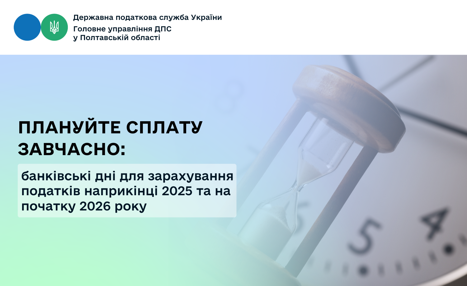 Головне управління ДПС у Полтавській області повідомляє, що відповідно до затвердженого Державною казначейською службою України Регламенту роботи органів Державної казначейської служби України, останнім банківським днем для зарахування платежів є 30 грудня 2025 року.