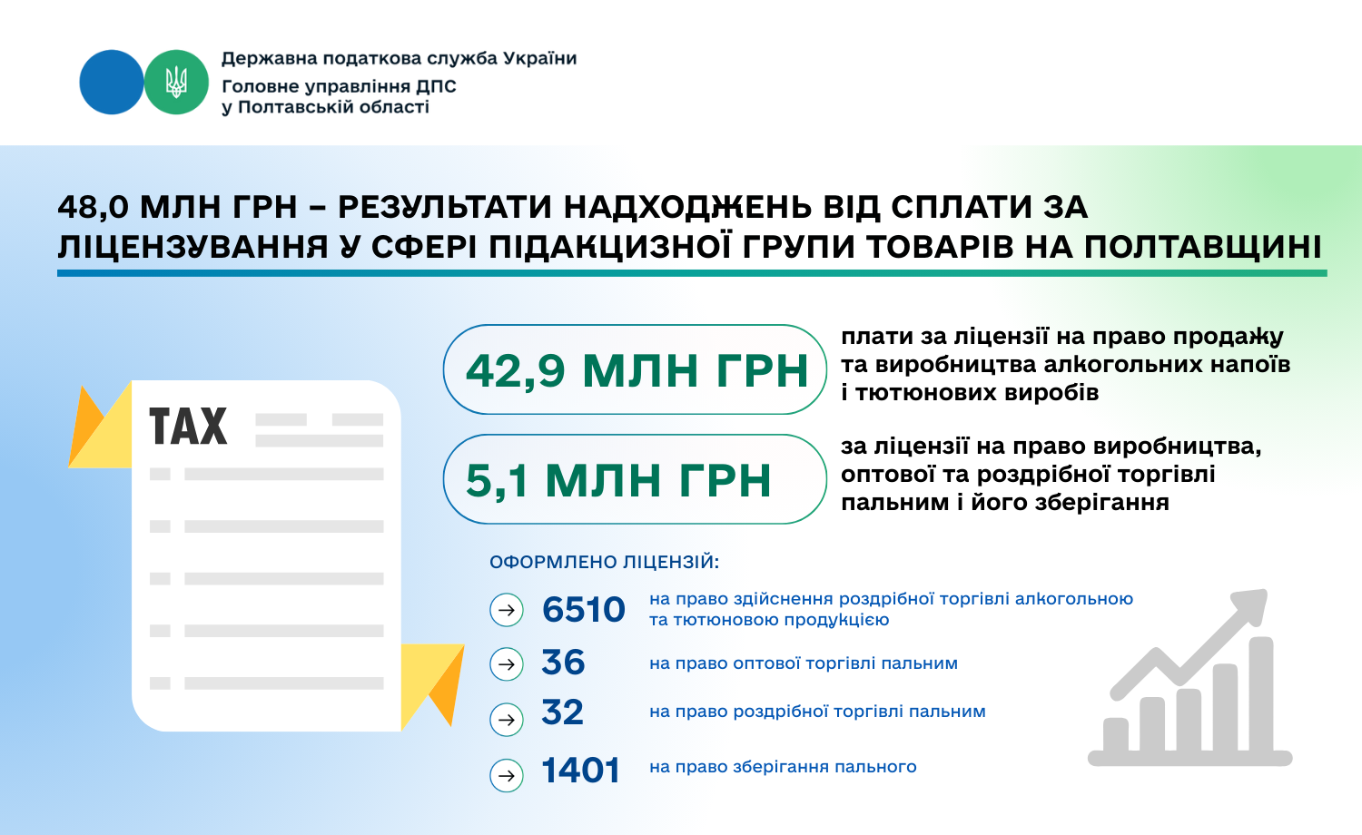6510 ліцензій на право здійснення роздрібної торгівлі алкогольною та тютюновою продукцією (4043 – ліцензії на право торгівлі алкогольними напоями, 2467 – ліцензій на право торгівлі тютюновими виробами);
