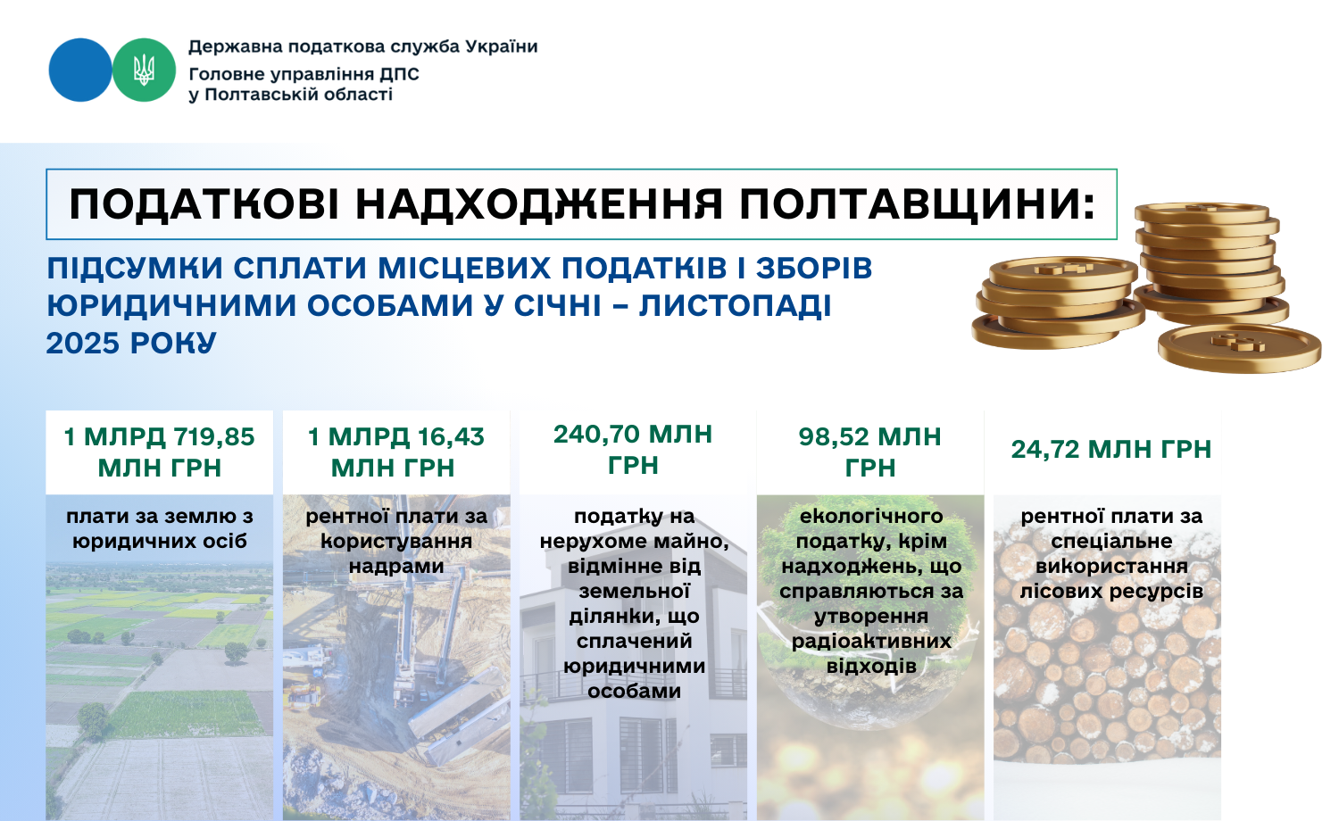 У січні – листопаді 2025 року юридичні особи перерахували до місцевих бюджетів понад 3,1 млрд грн податкових платежів. Про це повідомив начальник Головного управління ДПС у Полтавській області Сергій Левченко.