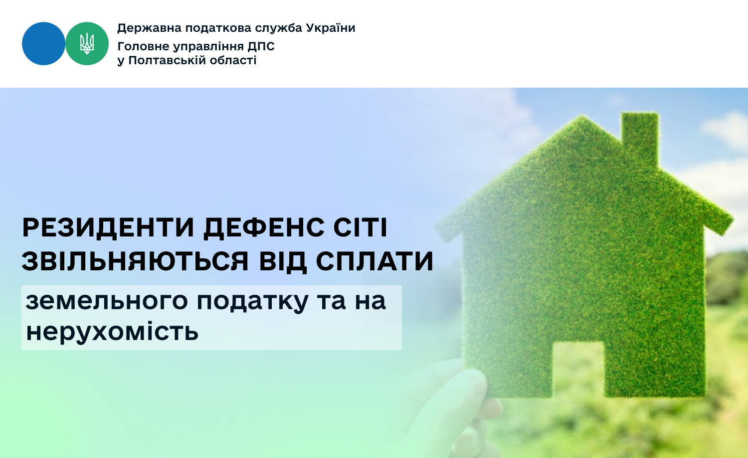 Головне управління ДПС у Полтавській області інформує, що резиденти Дефенс Сіті звільняються від сплати земельного податку та податку на нерухоме майно, відмінне від земельної ділянки. Звільнення застосовується з наступного місяця після отримання такого статусу і до завершення місяця, в якому його припинено.