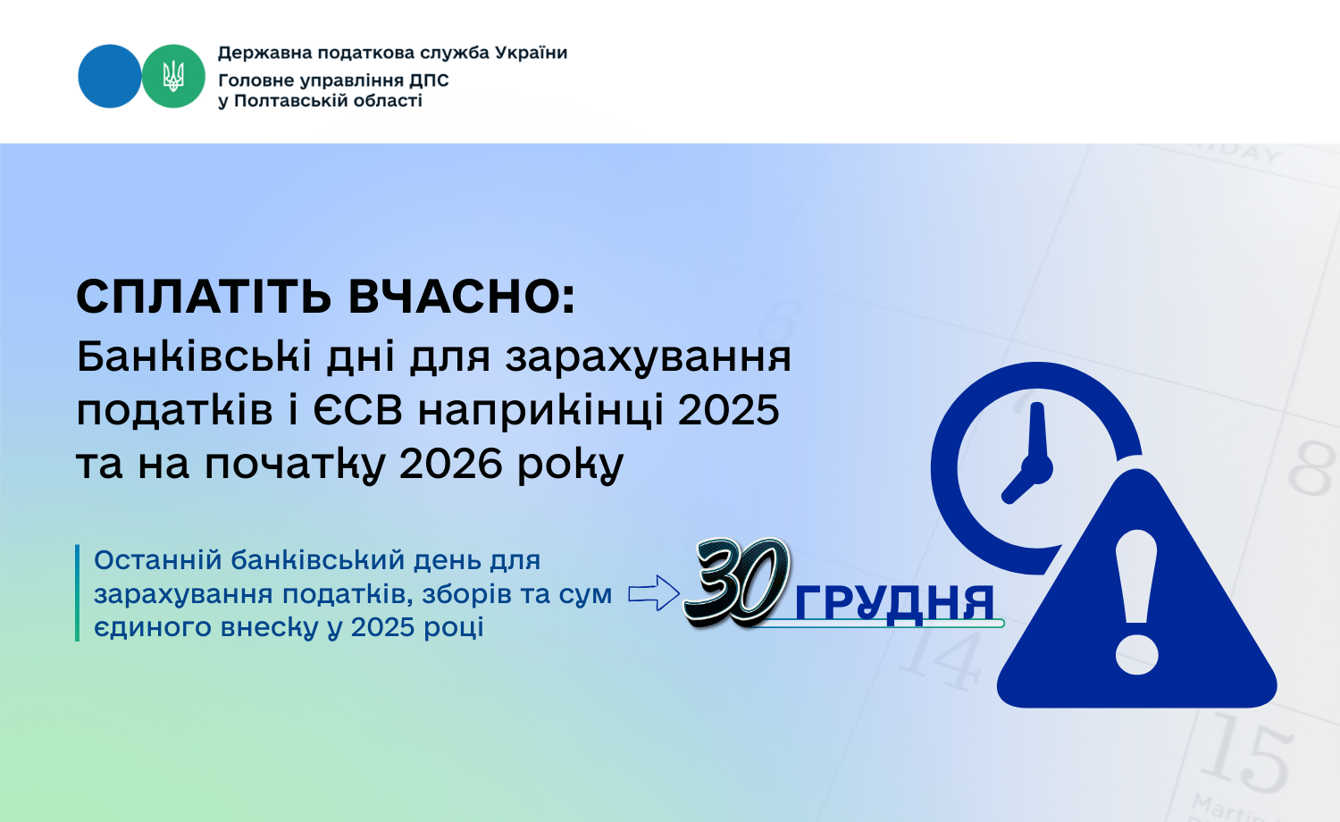 Головне управління ДПС у Полтавській області нагадує, що останнім банківським днем для зарахування податків, зборів та сум єдиного внеску  у 2025 році буде 30 грудня відповідно до Регламенту роботи органів Казначейства.