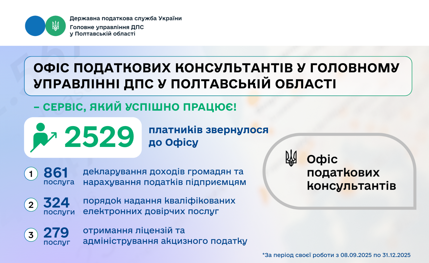 За період своєї роботи з 08.09.2025 по 31.12.2025 до Офісу податкових консультантів Головного управління ДПС у Полтавській області звернулося 2529 платників з метою отримати фахову консультацію стосовно застосування податкового законодавства.