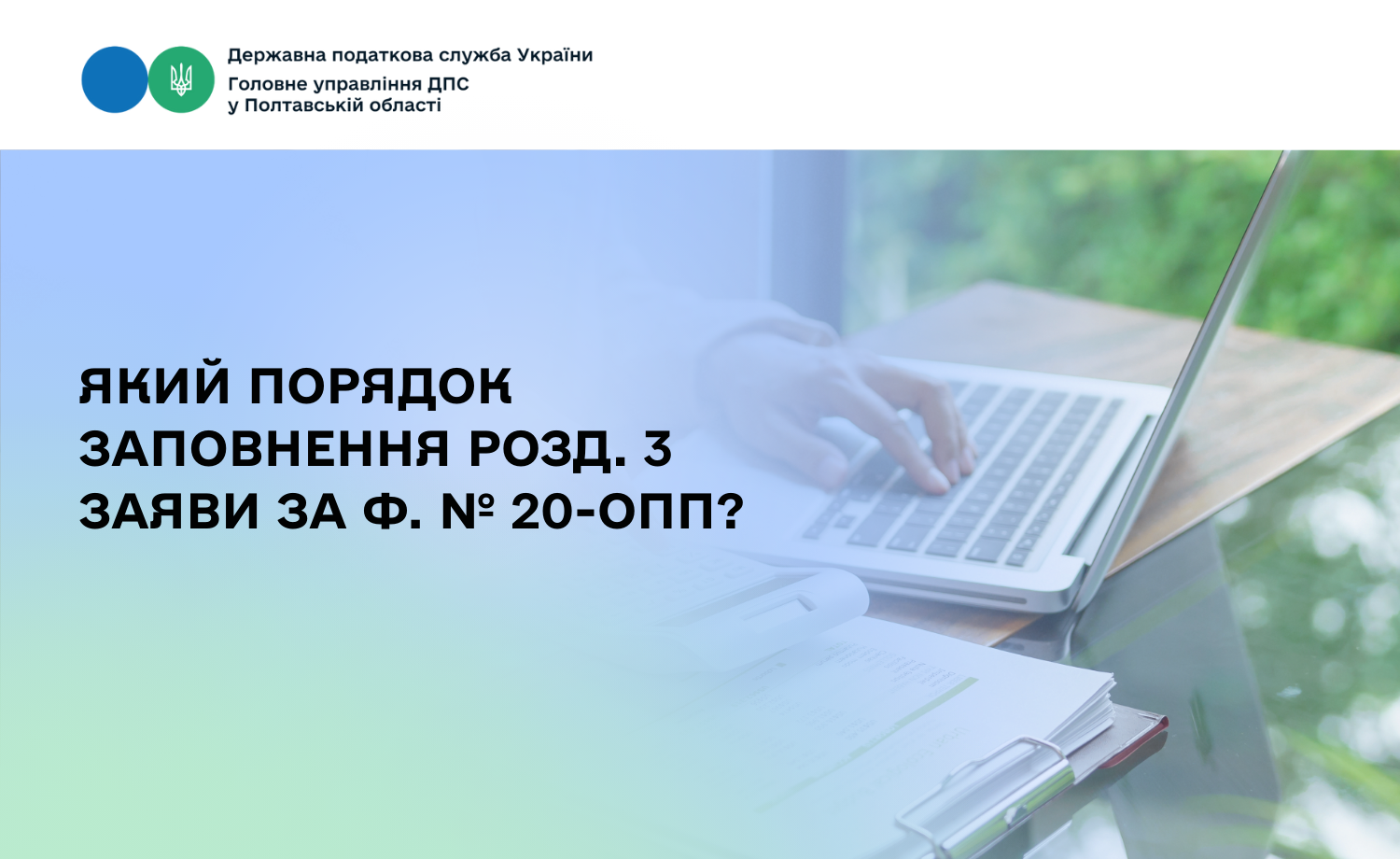 У Головному управлінні ДПС у Полтавській області повідомляють, що згідно з п. 8.1 розд. VIIІ Порядку обліку платників податків і зборів, затвердженого наказом Міністерства фінансів України від 09.12.2011 № 1588 із змінами і доповненнями (далі – Порядок № 1588), платник податків зобов’язаний повідомляти про всі об’єкти оподаткування і об’єкти, пов’язані з оподаткуванням, контролюючий орган за основним місцем обліку шляхом подання заяви про об’єкти оподаткування або об’єкти, пов’язані з оподаткуванням або через які провадиться діяльність за ф. № 20-ОПП (далі – Заява за ф. № 20-ОПП) (додаток 10 до Порядку № 1588) у порядку, встановленому розд. VIIІ Порядку № 1588.