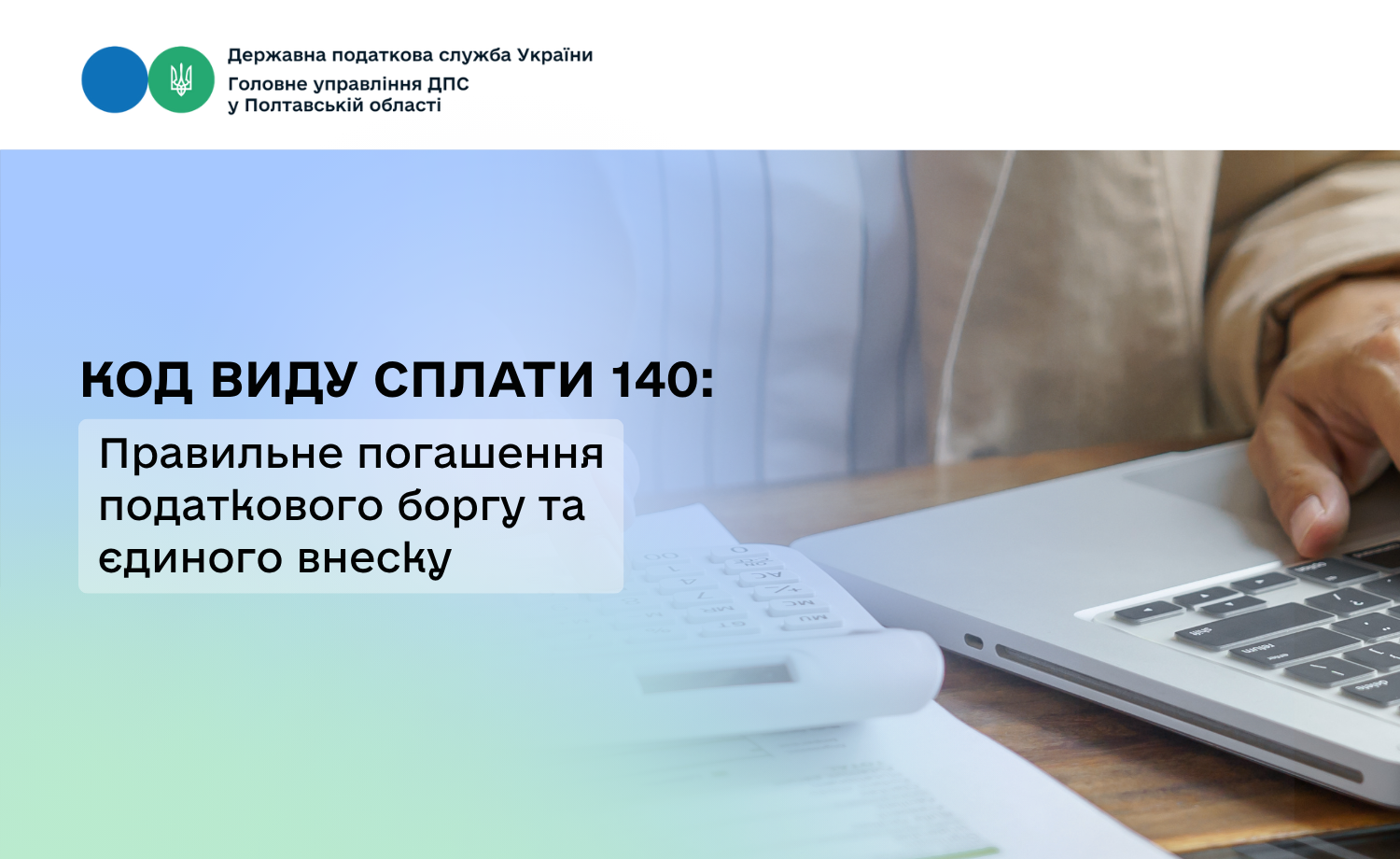 У полі «Код виду сплати» платник заповнює код виду сплати, визначений Переліком кодів видів сплати, які використовуються платниками, згідно з додатком 1 до Порядку, а саме (при сплаті податкового боргу/заборгованості з єдиного внеску): 140 - Сплата коштів у рахунок погашення податкового боргу / заборгованості з єдиного внеску/грошових зобов’язань;