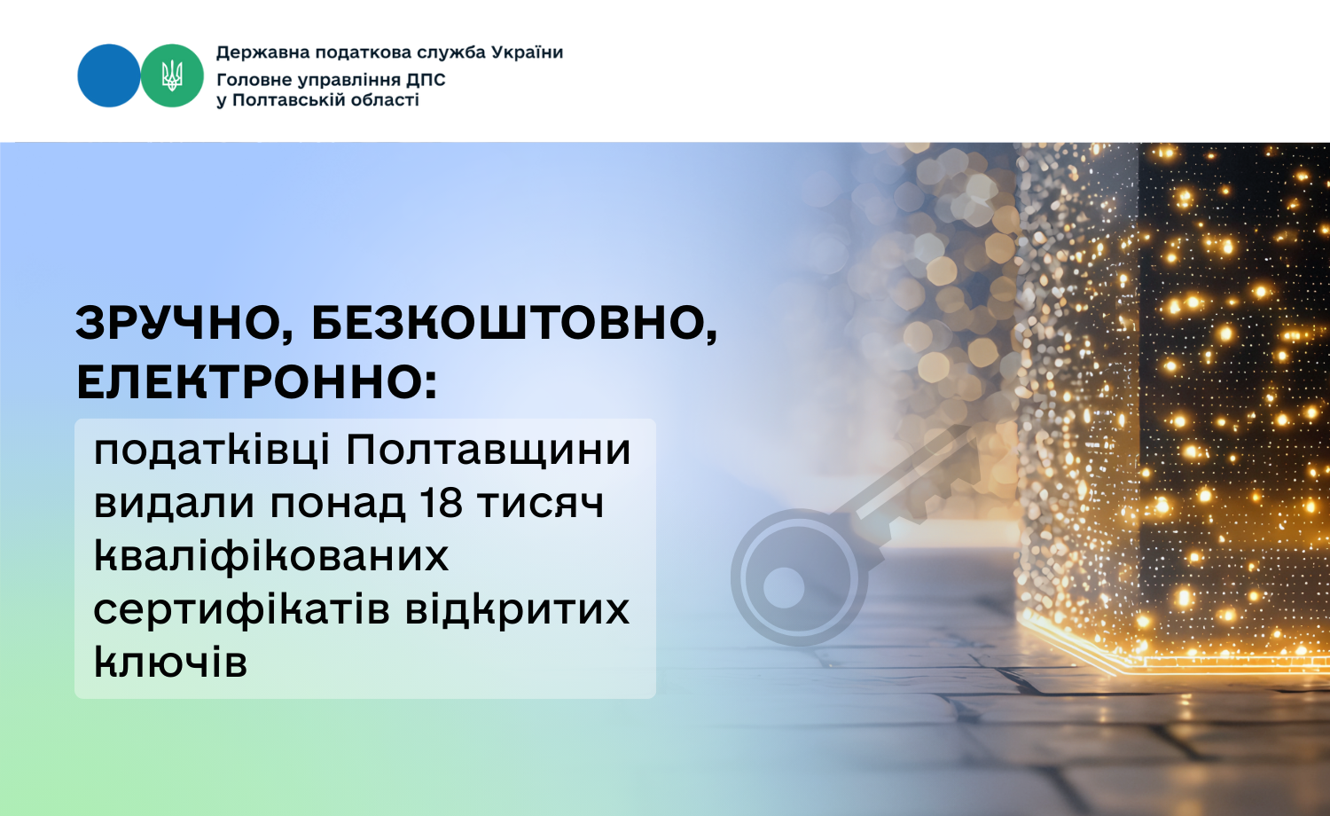 Упродовж січня – грудня 2025 року фахівцями сектору реєстрації користувачів Головного управління ДПС у Полтавській області сформовано 18620 безкоштовних кваліфікованих сертифікатів відкритих ключів: у відокремлених пунктах реєстрації м. Полтави – 12724 та м. Кременчука – 5896.