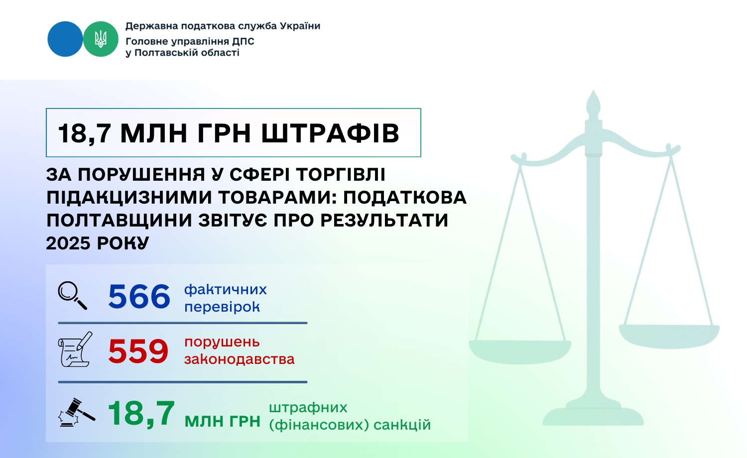 Протягом січня – грудня 2025 року фахівці Головного управління ДПС у Полтавській області провели 566 фактичних перевірок суб’єктів господарювання щодо дотримання вимог законодавства під час здійснення роздрібної торгівлі алкогольними та тютюновими виробами, а також торгівлі пальним.