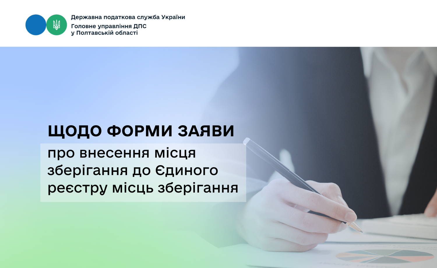 Головне управління ДПС у Полтавській області інформує, що з 23 травня 2025 року діє нова форма заяви щодо внесення місць зберігання до Єдиного державного реєстру місць зберігання.
