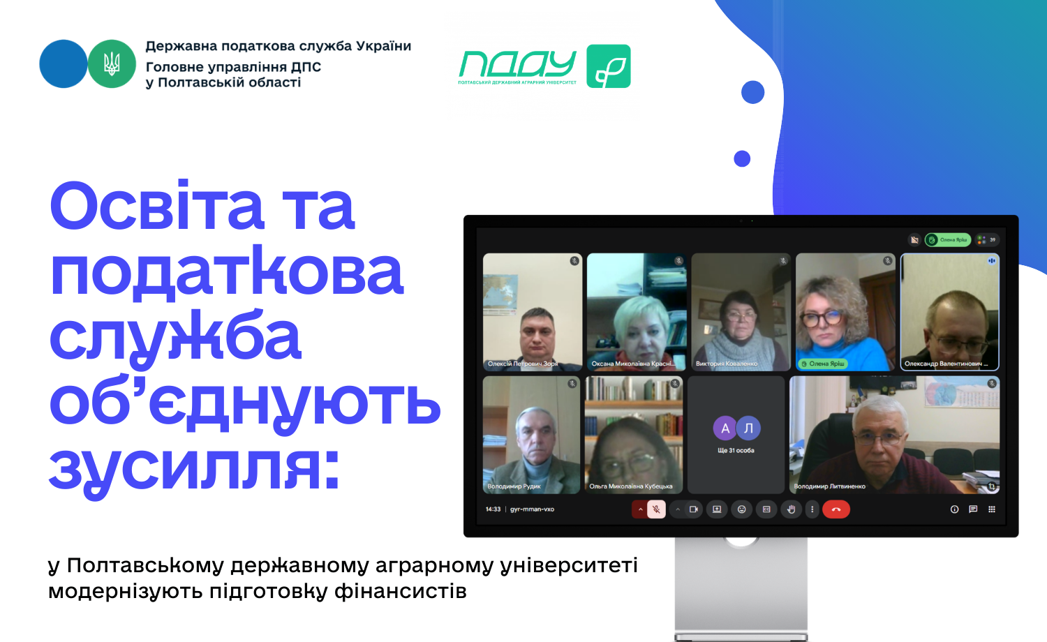 Нещодавно представники Головного управління ДПС у Полтавській області, за запрошенням Полтавського державного аграрного університету, взяли участь в обговоренні проєктів освітніх програм «Фінанси, банківська справа та страхування» підготовки здобувачів бакалаврського та магістерського рівнів вищої освіти спеціальності D2 Фінанси, банківська справа, страхування та фондовий ринок.