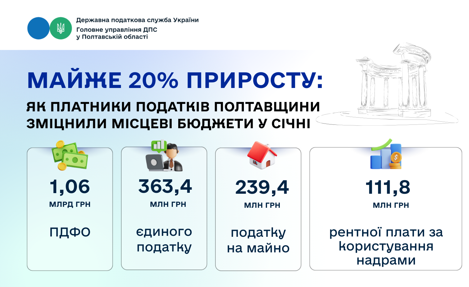 Перший місяць 2026 року став періодом інтенсивного наповнення скарбниць територіальних громад регіону. За січень 2026 року до місцевих бюджетів Полтавської області надійшло 1 млрд 832,2 млн грн податків та зборів. Це на 294,8 млн грн, або на 19,2 відс. більше, ніж за аналогічний період минулого року.