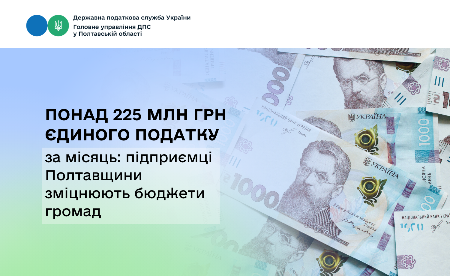 У січні 2026 року фізичні особи-підприємці Полтавщини, які перебувають на спрощеній системі оподаткування, перерахували до місцевих бюджетів області 225,6 млн грн єдиного податку (без врахування 4 групи). Цей показник свідчить про впевнену позитивну динаміку: порівняно з січнем 2025 року надходження зросли на 18,4 млн грн, що становить 8,9% приросту.