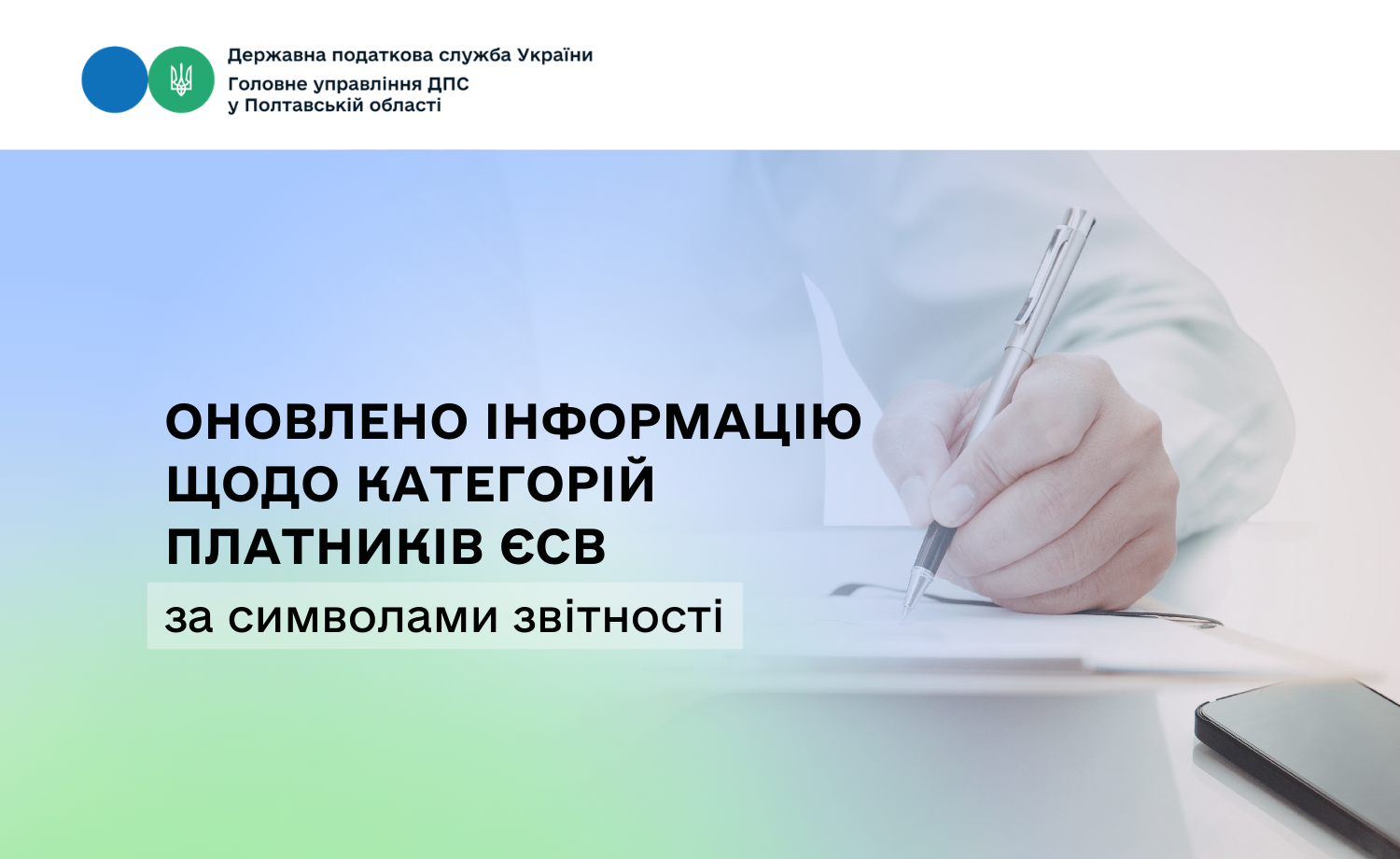 Головне управління ДПС у Полтавській області інформує, що для платників єдиного внеску на загальнообов’язкове державне соціальне страхування оновлено інформацію про категорії платників у розрізі символів звітності, за якими здійснюється сплата ЄСВ.