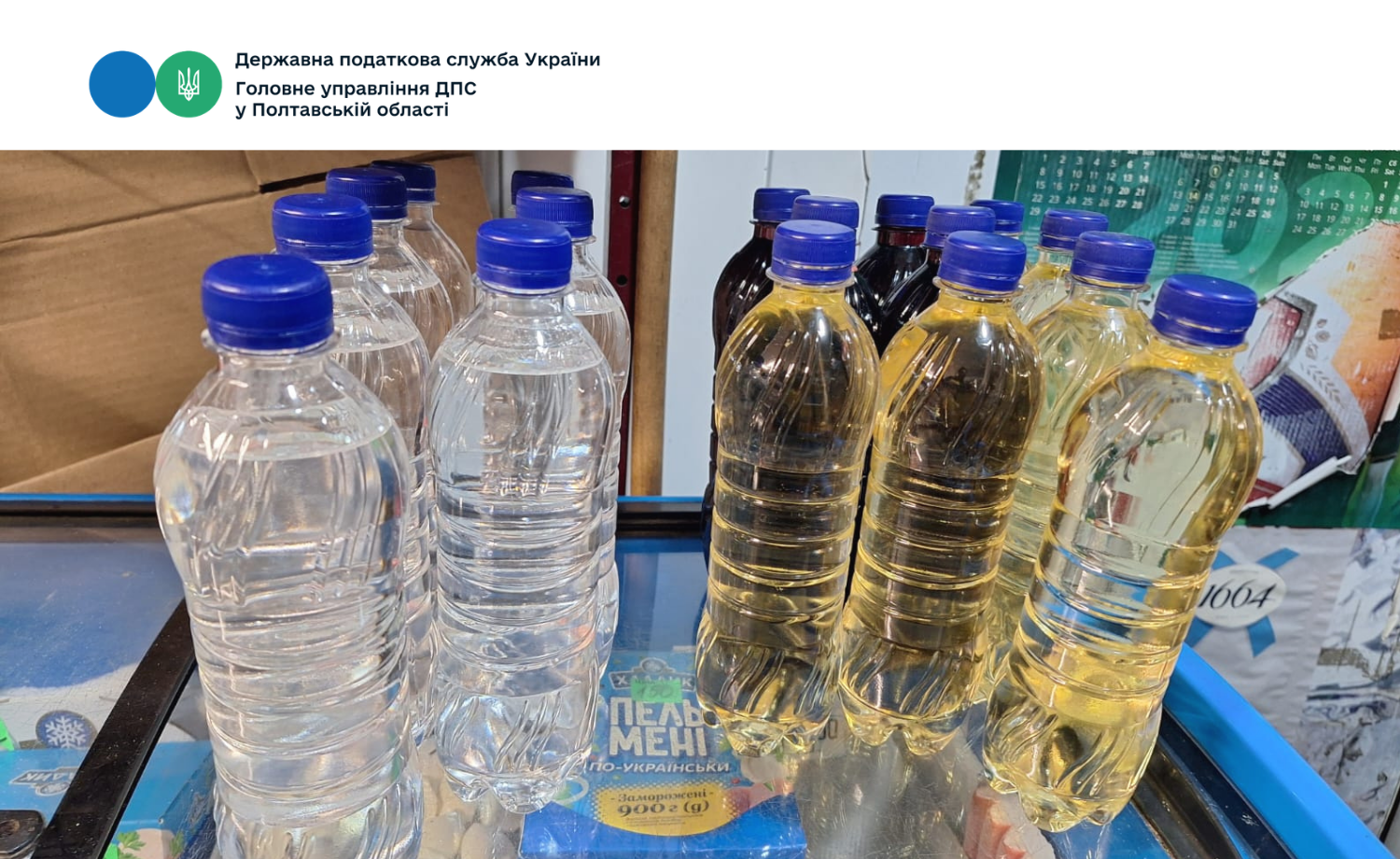 Фахівцями управління контролю за підакцизними товарами Головного управління ДПС у Полтавській області проведено фактичну перевірку суб'єкта господарювання та виявлено факт реалізації та зберігання алкогольних напоїв, розлитих в пластикові пляшки без марок акцизного податку та будь-яких логотипів.