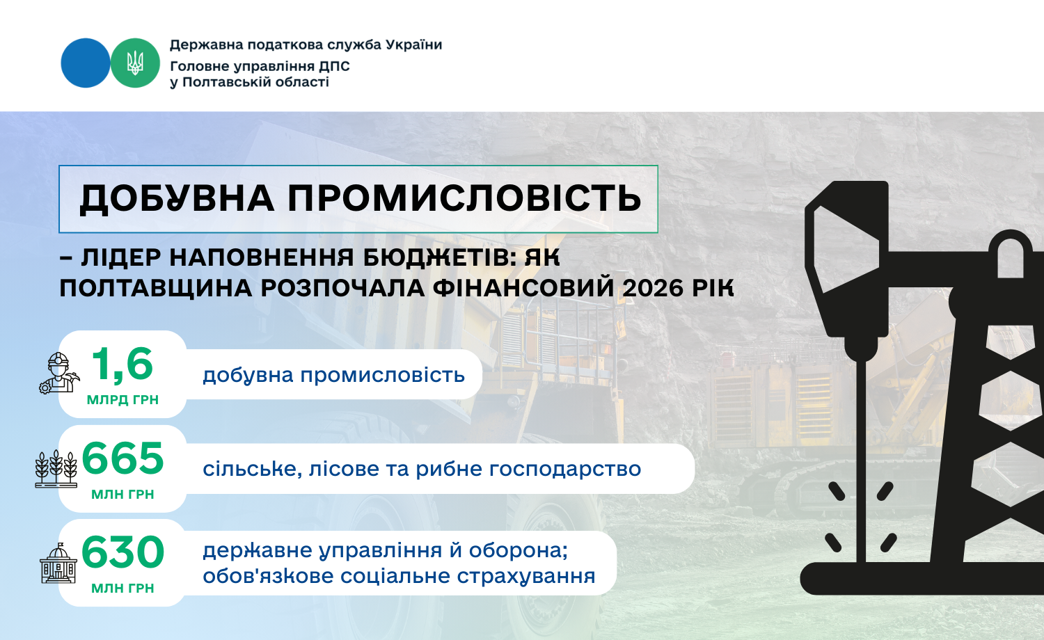 У січні 2026 року економічний потенціал Полтавської області конвертувався у вагомі фінансові показники, забезпечивши стабільне наповнення Зведеного бюджету України. Безумовним лідером за обсягами сплачених податків стала добувна промисловість – 1 млрд 642,7 млн грн, що дорівнює майже третині усіх надходжень області (30,9 відсотка).